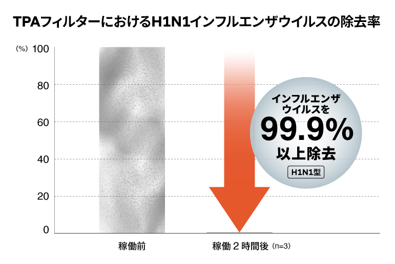 TPAフィルターは空間に浮遊しているインフルエンザウイルスを99.9%以上捕集